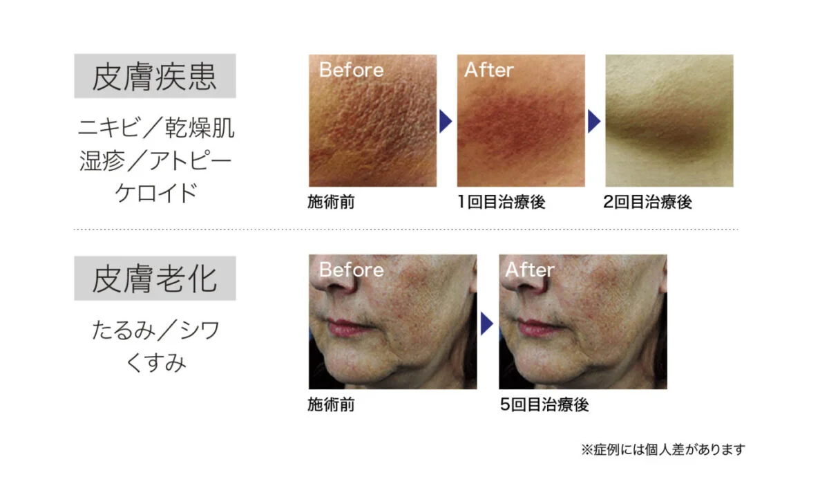 新陳代謝を促進し、血液の供給が増え、ヒアルロン酸やコラーゲンの生成を活性化し、エイジングケアから皮膚疾患までマルチに対応し、しっとりとしたお肌へ導きます。