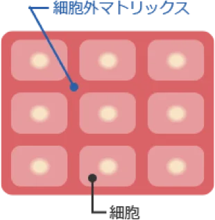 細胞外マトリックスとは、皮膚などを構成する細胞間を埋めるタンパク質などからなる物質で、肌組織の維持と結合に重要な役割を果たします。