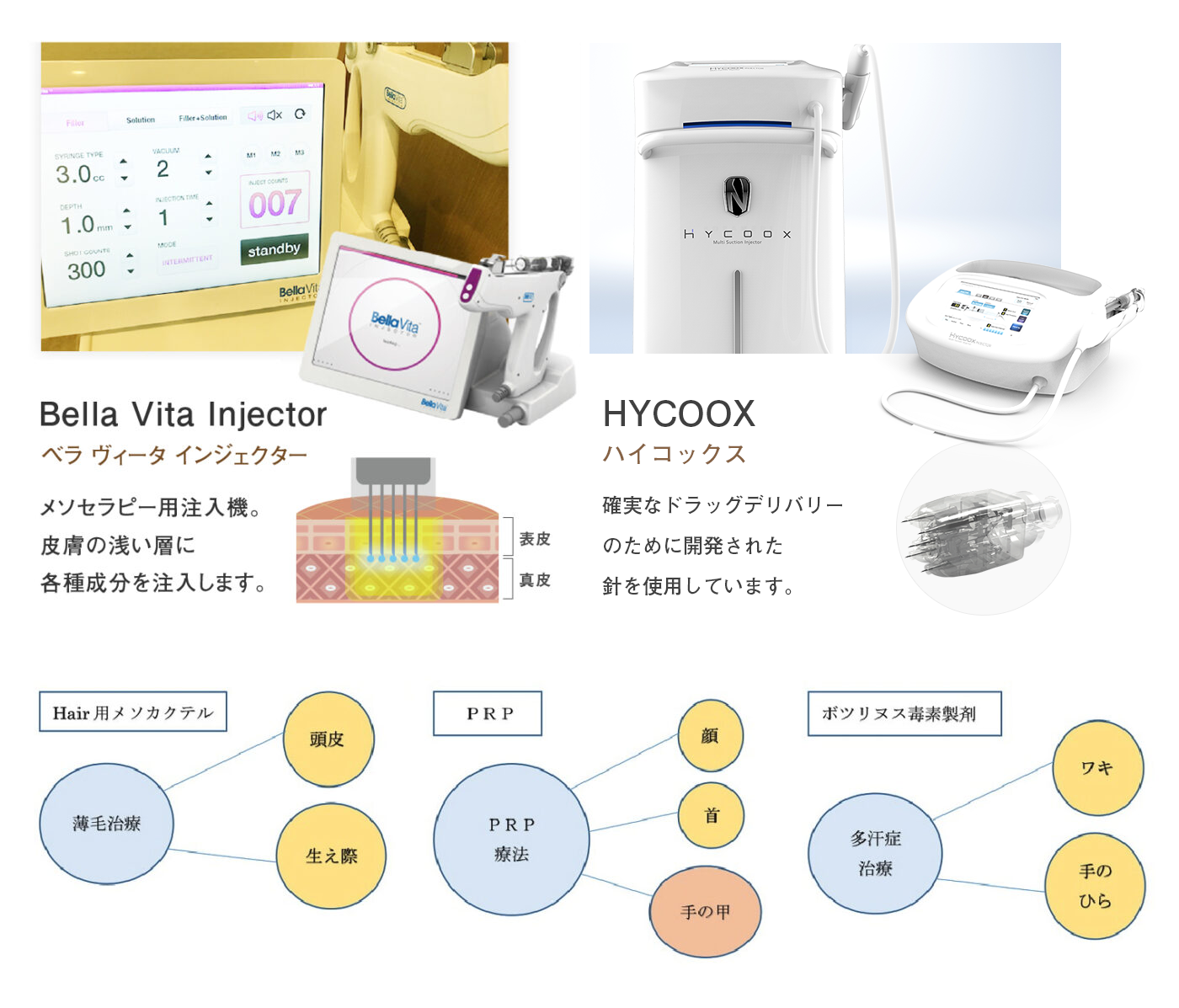 フォーシーズンズ美容皮膚科では水光注射でメソセラピー用注入器BellaVita Injector(べラヴィータインジェクター)を使用。皮膚の浅い層(基底膜層〜真皮層)に各種成分を注入します。